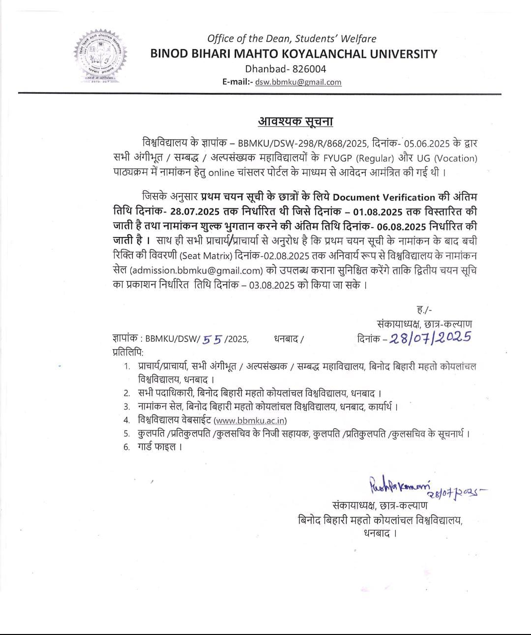 Extension for varification in 1st list of admission of FYUGP 2025-202/29